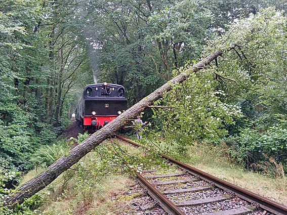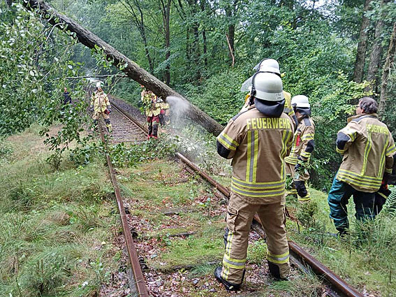 Für unsere kleine Bügelsäge war der Stamm zu dick. Die FFW Groß Ippener war innerhalb von 20 Minuten vor Ort, so dass wir die Fahrt mit 35 Minuten Verspätung fortsetzen konnten.