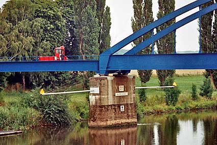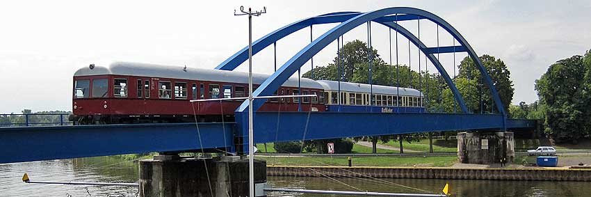 Der GDT 518 der Verkehrsfreunde Lüneburg und der T3 (Kaffkieker) der VGH auf der Weserbrücke in Hoya |