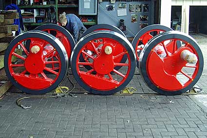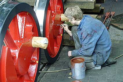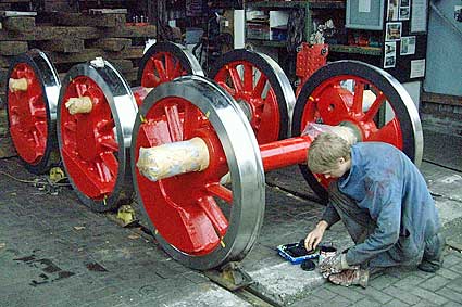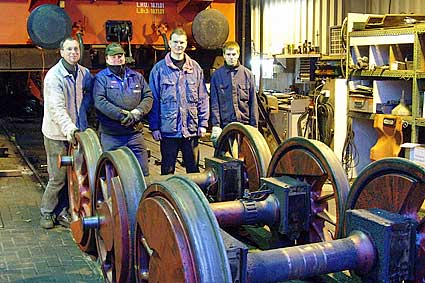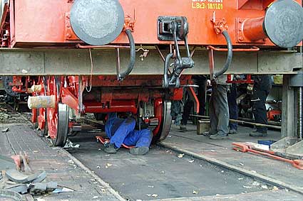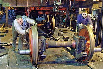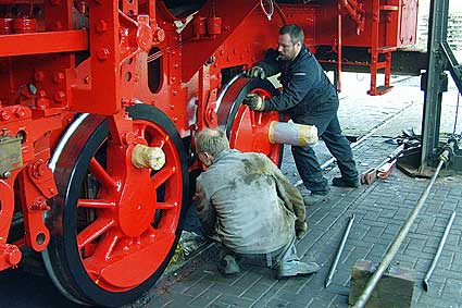Achsen kommen wieder unter die Lok. Das Einachsen erfordert viel Kraft und Geschicklichkeit