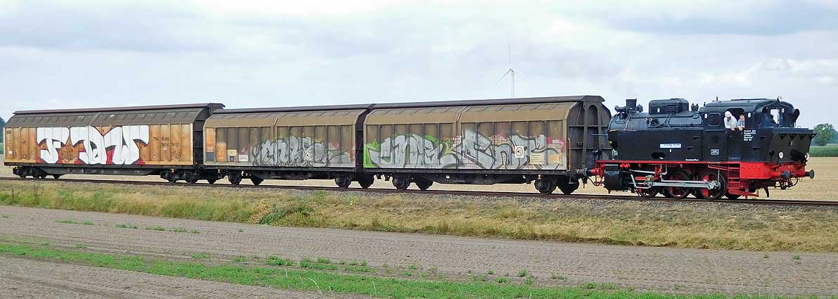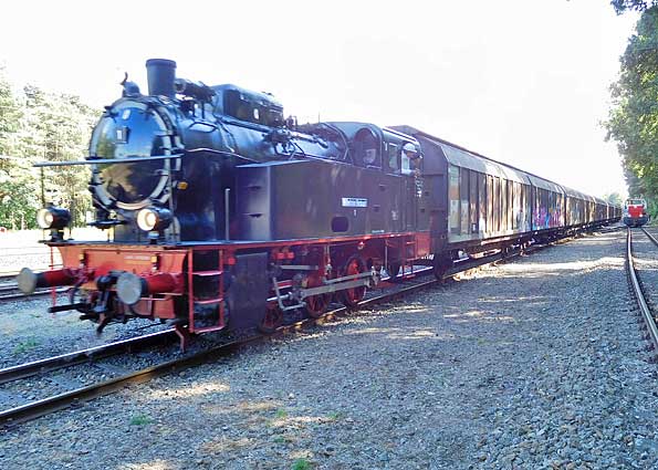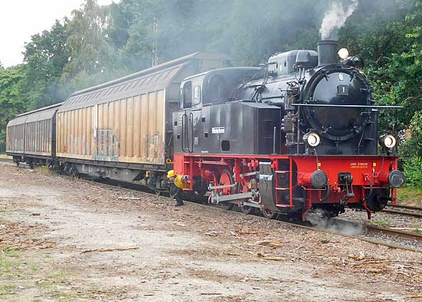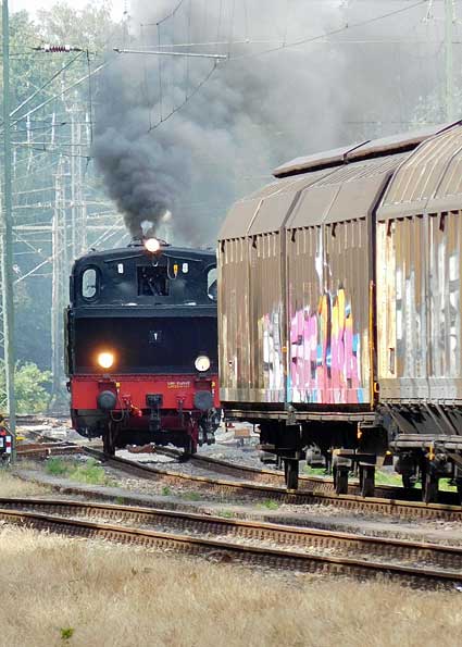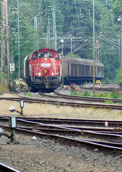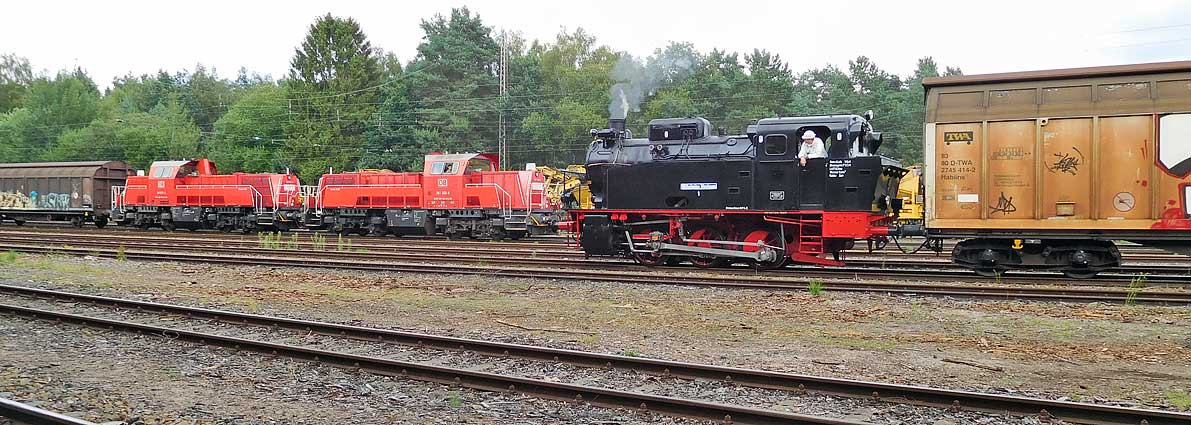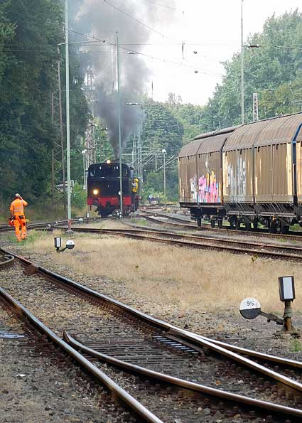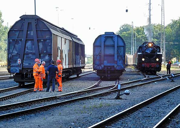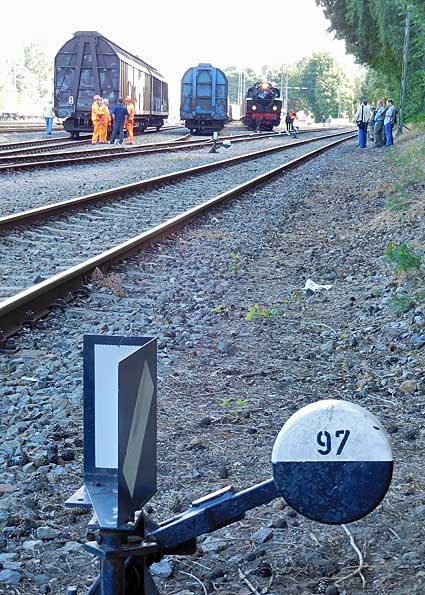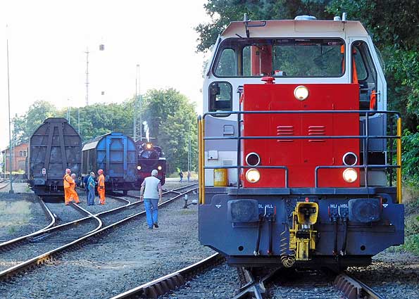 Der für die Rangierarbeiten erwartete Güterzug erreicht Eystrup >>