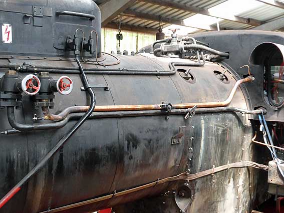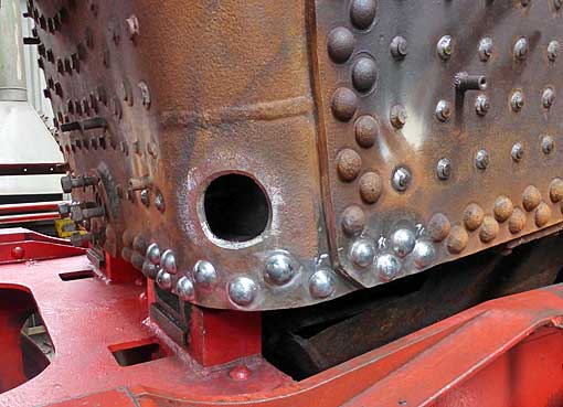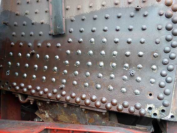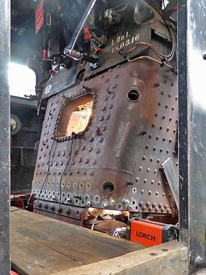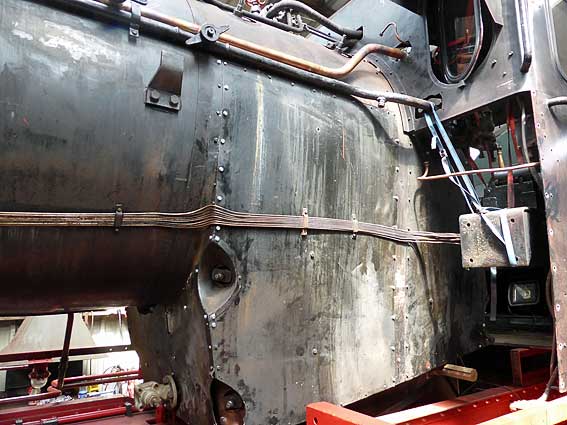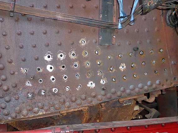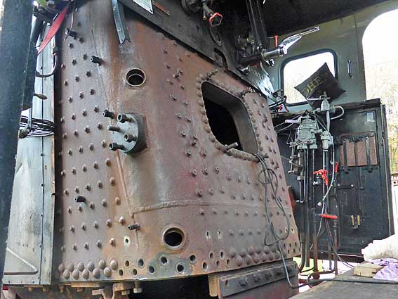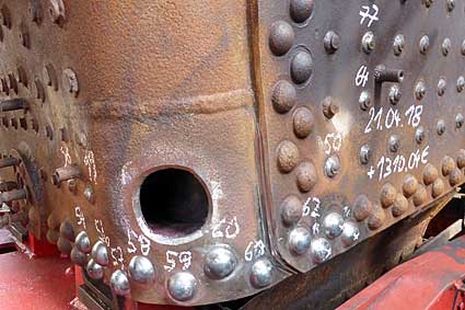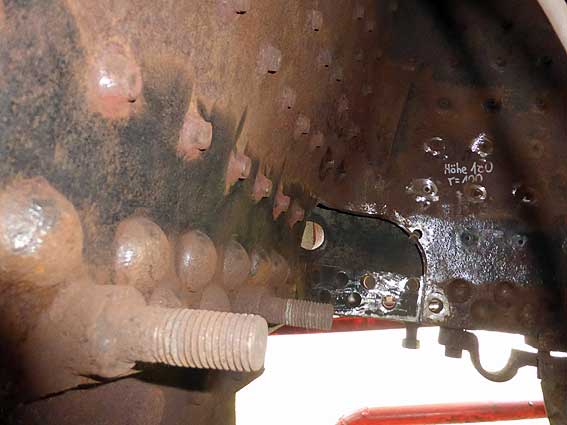 Der freigelegte Kessel im Führerstand. Unten im Bogen sind Bodenringniete ausgebaut.