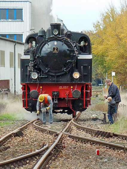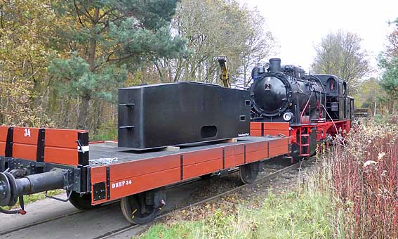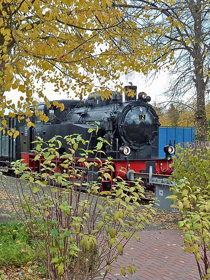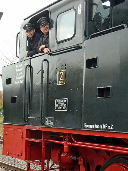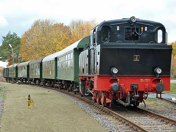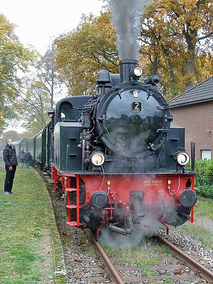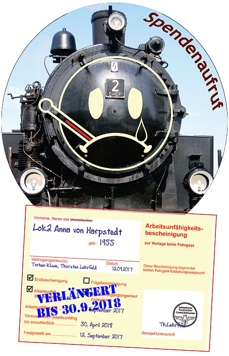 11. November 2018: Lok 2 Anna von Harpstedt: Nach mehr als einem Jahr mit großen und kleinen Leiden melde ich mich als genesen zurück! Meine heutige Probefahrt nach Heiligenrode mit (fast) allen Waggons und dem „Ärzte“team an Bord war erfolgreich und nun freue ich mich schon auf die Nikolausfahrten, wenn meine Lampen wieder in viele strahlende Kinderaugen blicken dürfen.