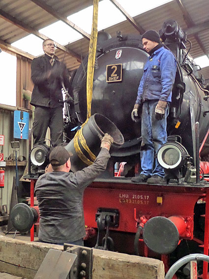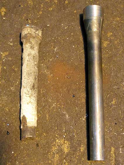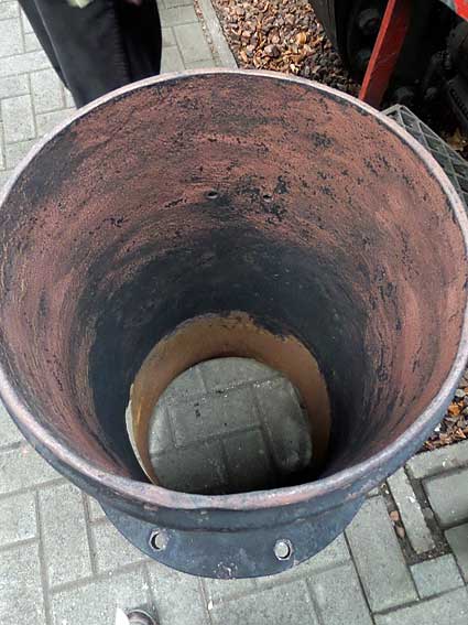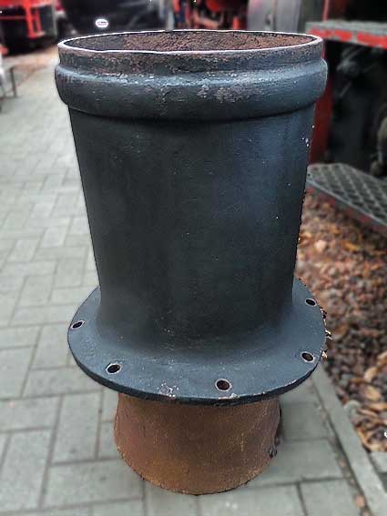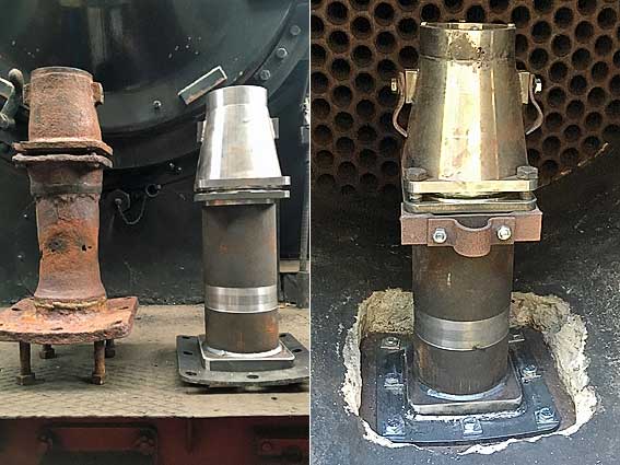 Alt und Neu. Das neu angefertigte Blasrohr macht deutlich, wie stark das alte abgezehrt war und dass eine Erneuerung dringend nötig war. Rechts: Das neue Blasrohr ist in der Rauchkammer eingebaut. Der untere Teil muss jetzt mit Schammotmasse vergossen werden, um ihn vor Korrosion zu schützen.