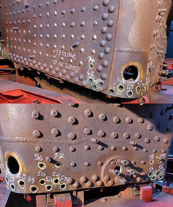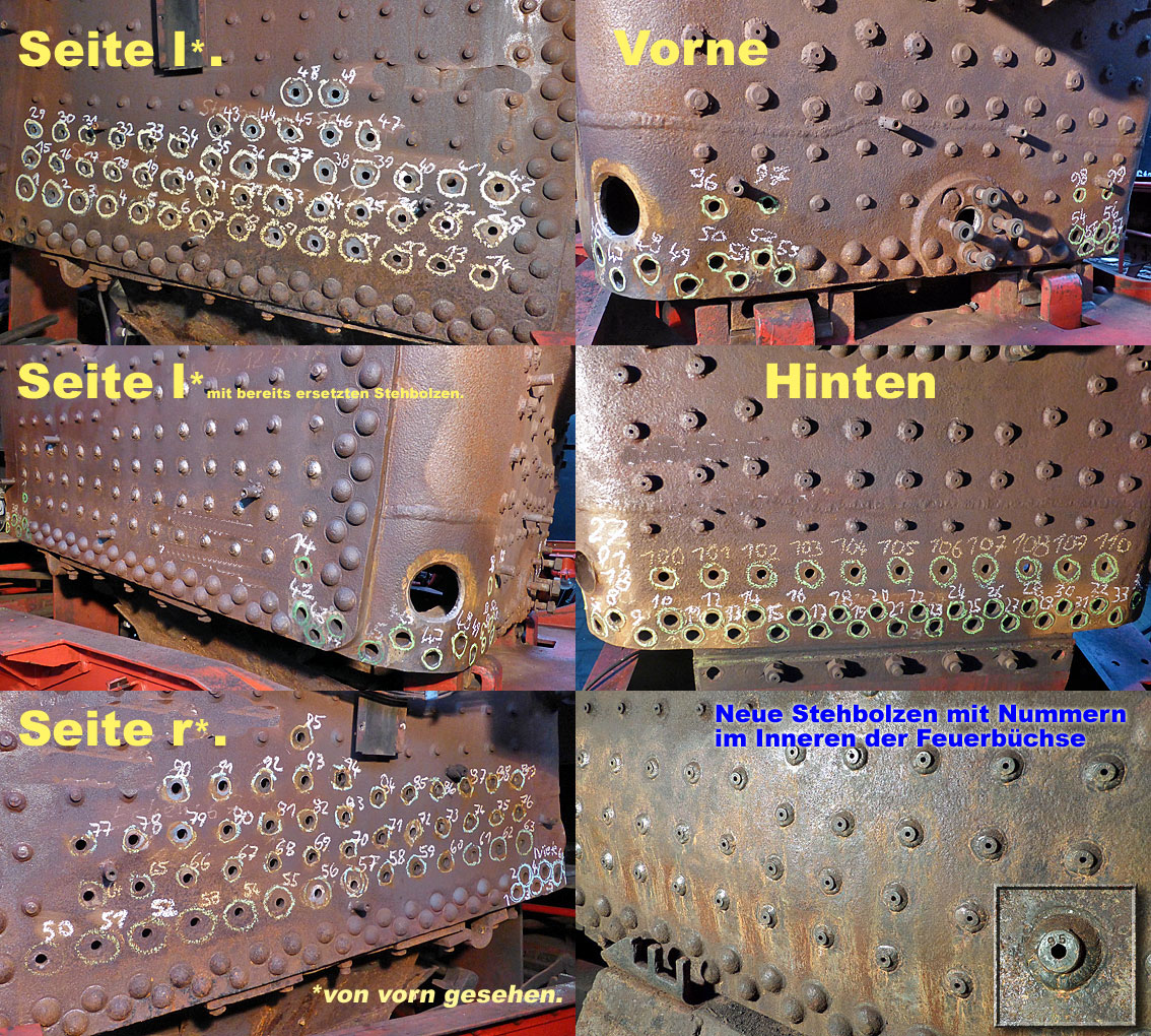 Hallo liebe Freunde,Im Kessel rund um meine Feuerbüchse, wo Feuer und Wasser eng zusammenarbeiten um mir Dampf zu machen, kommen Feuer und Wasser jetzt manchmal zusammen - und das darf nicht sein.110 Stehbolzen (Foto unten links) - die halten die Feuerbüchse im Kessel - müssen zum Stückpreis von 60€ (inkl. Einbau!) erneuert werden und auch etliche Niete sowie die Wände der Feuerbüchse und neuerdings noch der Schornstein bedürfen einer Reparatur.All