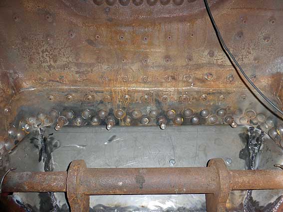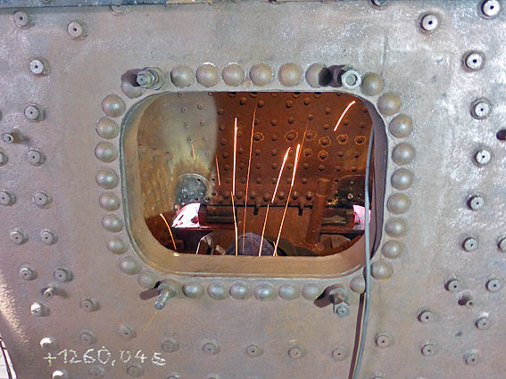 Innenansicht der Feuerbüchse, schadhafte Ecke ausgeschnitten.