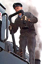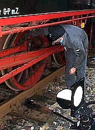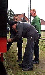 Es ist kurz vor 17:30 Uhr am 17. September 2000Zusammen mit dem frischgebackenen Lokführer Torben Kluwe und seinem Heizer Ralf Petersen besteige ich die Lok 1, die den Zug von Harpstedt nach Delmenhorst bringen soll. Eine letzte Werkzeugkontrolle vor der Abfahrt. Sicher ist sicher! |